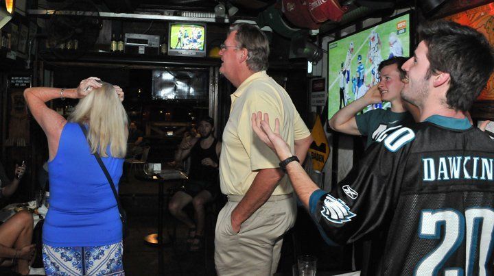 Mientras, adentro se escuchaba el "go, go, Eagles" (Vamos vamos Águilas), afuera del bar, era otro mundo, otro deporte, otra pasión. Las mesas estaban completas de simpatizantes que miraban el segundo tiempo de San Lorenzo y Boca por la Supercopa, que empataban 1 a 1. Cuando terminó un cliente solicitó si podían poner el partido de Racing Club y Huracán. El fútbol argentino era la premisa para las mesas de la vereda en la calle Colón.