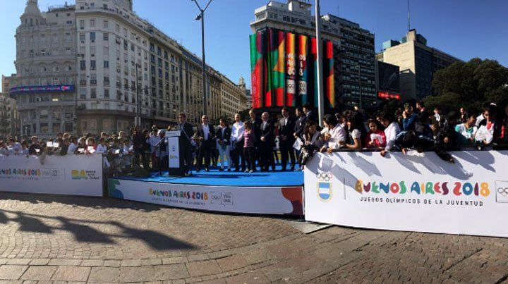 El velista Lange, habituado a manejar las poleas de los botes y catamaranes, intentó destrabar el engranaje pero no pudo. Entonces, los deportistas, dirigentes y funcionarios, entre ellos el jefe de Gobierno porteño, Horacio Rodríguez Larreta, extendieron la bandera de los cinco anillos en la Plaza de la República para las fotografías de rigor.