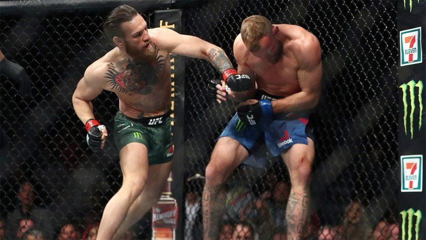 Apenas comenzó el combate, el irlandés se abalanzó sobre su rival e intentó conectarle un golpe de izquierda que casi lo hace pasar de largo. Todos pensaron que se trataba de un inicio errático, pero Conor tenía un as bajo la manga: le metió un rodillazo en la cara y luego ejecutó cuatro golpes con el hombro izquierdo sobre la nariz del norteamericano.