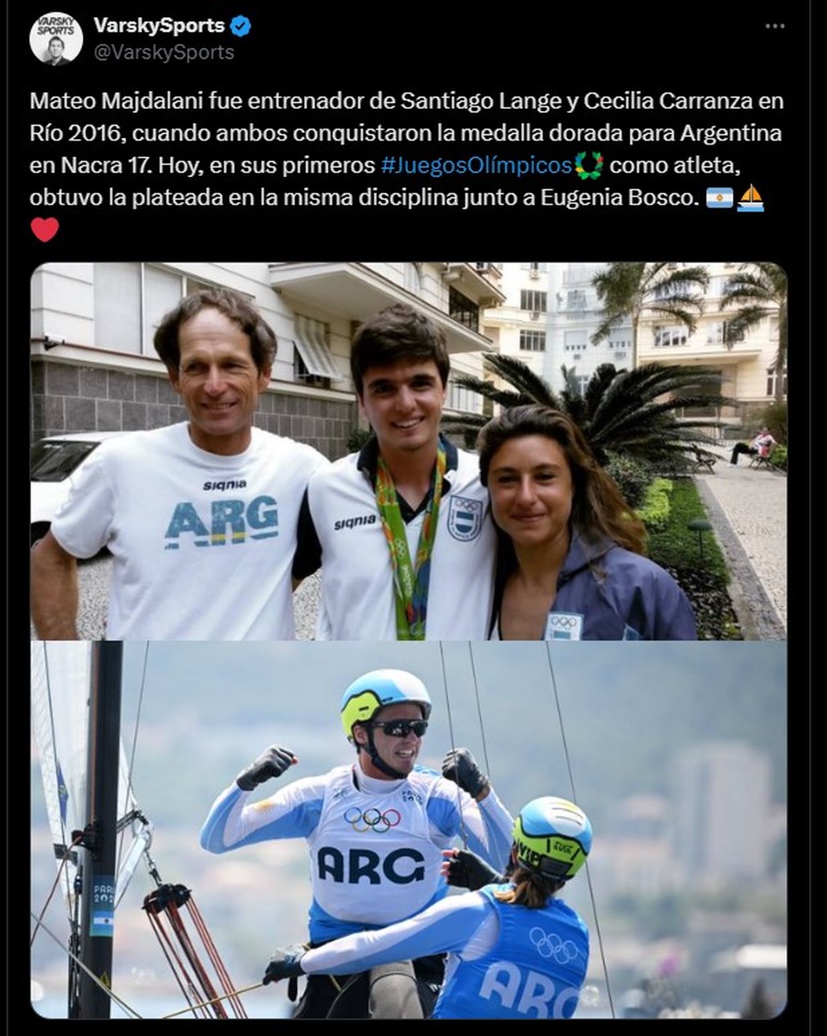 "Hicieron un trabajo increíbleCuando uno tiene un sueño, hay que laburar. Mateo y Eugenia dejaron todo. Formaron un equipo increíble. Qué gran felicidad para Argentina, para la vela, qué honor estar acá. Hay un montón de potencial. Siempre que haya alguien que demuestre que se puede, ayuda un montón", expresó Santiago Lange, ganador de la medalla de oro en Nacra 17 en los Juegos de Río.