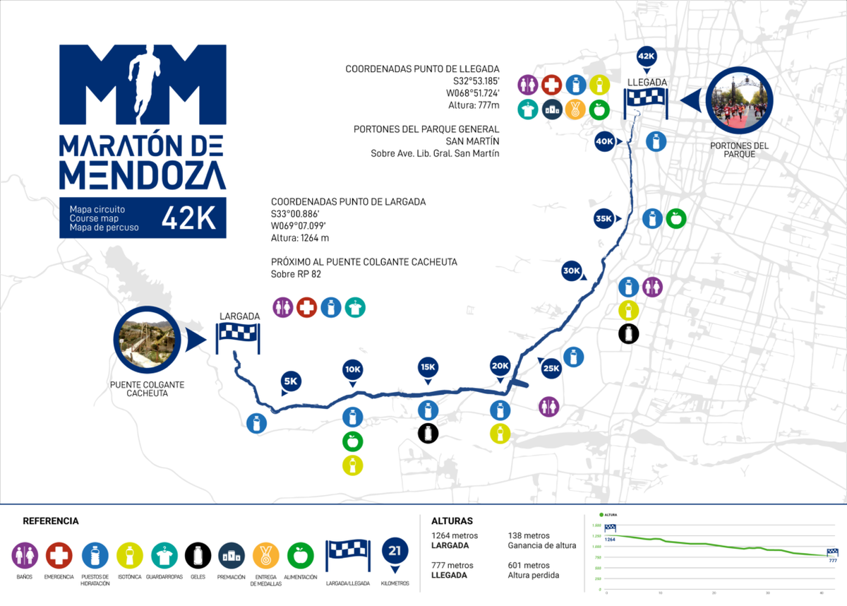 En cuanto a las largadas, la distancia principal de 42 kilómetros iniciará en los puentes de Cacheuta a las 8, mientras que la media maratón partirá desde el barrio Portal Vistalba y los 10 kilómetros desde la Rotonda de Palmares Valley. La prueba de 4 kilómetros tendrá su largada y llegada en el Parque General San Martín, a metros de los tradicionales portones.