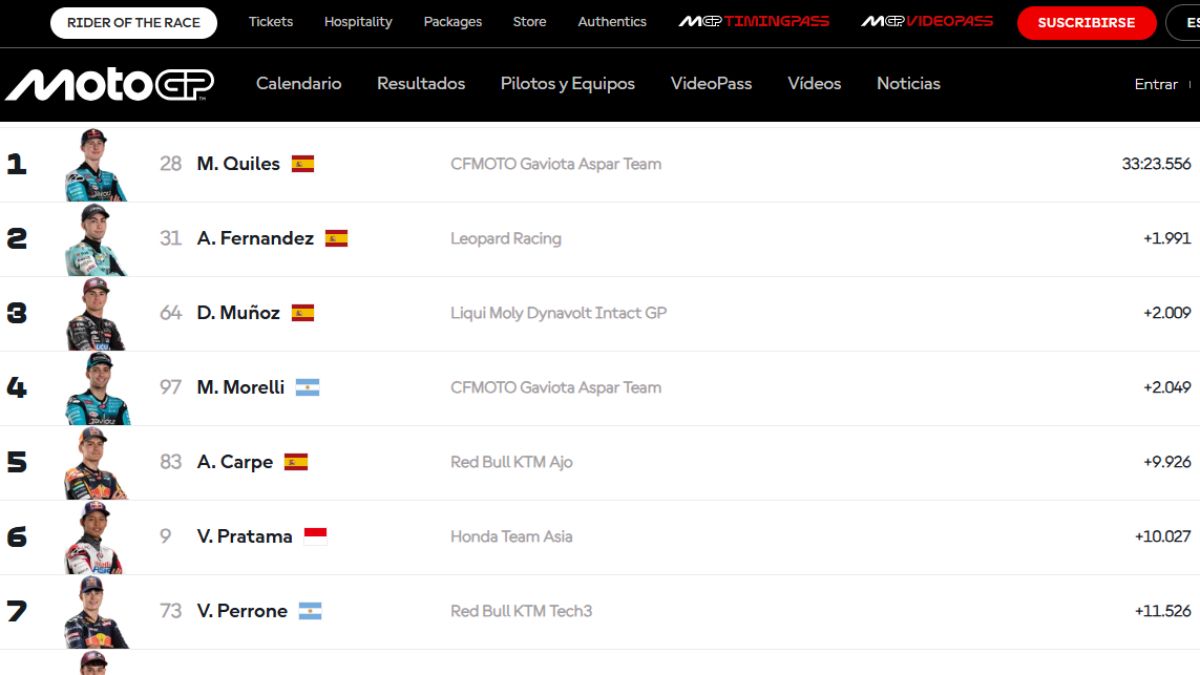 Valentín Perrone, por su parte, avanzó del 12º al cuarto puesto en el inicio, pero perdió ritmo. Un toque con Jesús Ríos lo relegó al 13º lugar, aunque logró recuperarse hasta el séptimo puesto final. El argentino se ubica cuarto en el campeonato, a 43 unidades de la cima.