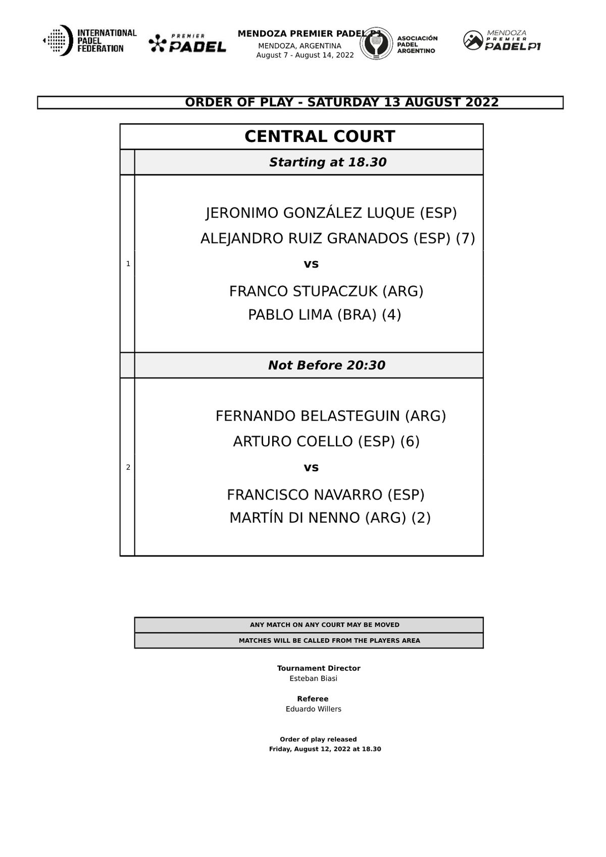 Luego, no antes de las 20.30, saldrá a la cancha una vez más el legendario Fernando Belasteguín junto al español Arturo Coello (6) y enfrente estarán nada menos que los 2dos. favoritos, Martín Di Nenno y el español Paquito Navarro.