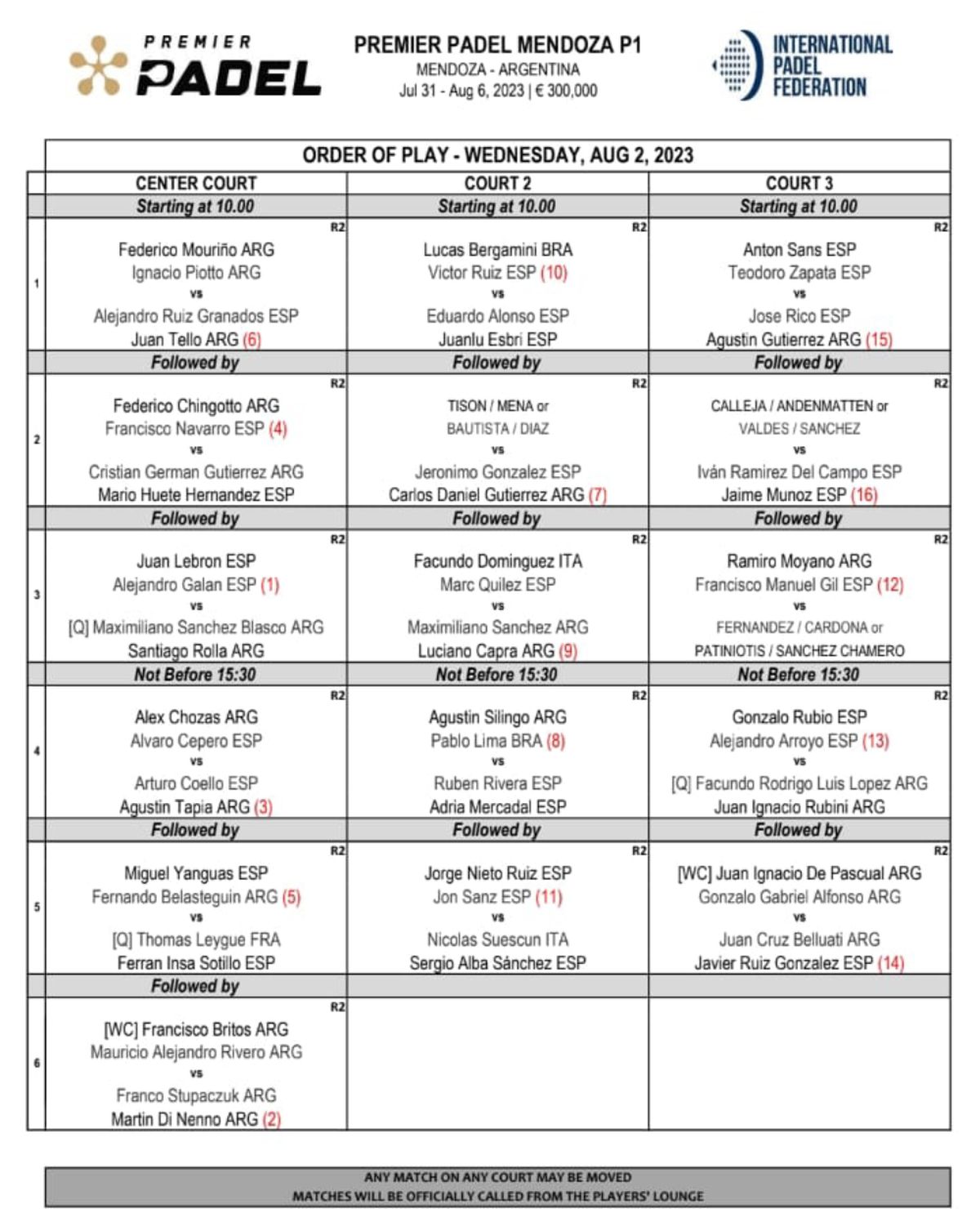 A partir de las 15:30 tendrá su estreno la pareja del momento y del año conformada por el argentino Agustín Tapia y el español Arturo Coello ante Alex Chozas (Argentina)-Álvaro Cepero (España).