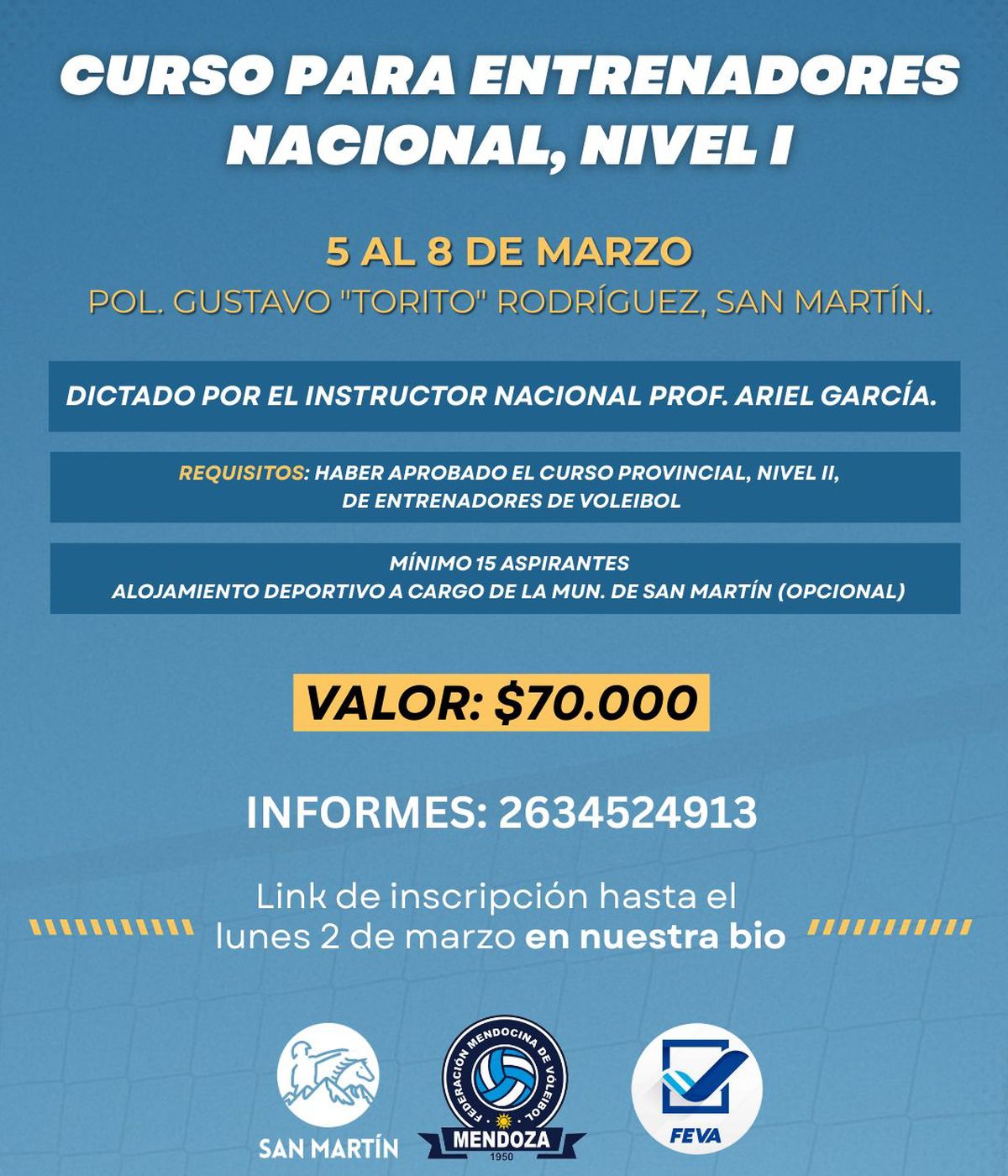 La Federación Mendocina de Voleibol informa, que se encuentra abierta la inscripción para el curso de Técnico Nacional I, que se realizará los días 5 al 8 de marzo y será dictado por el instructor Nacional Prof. Ariel García.