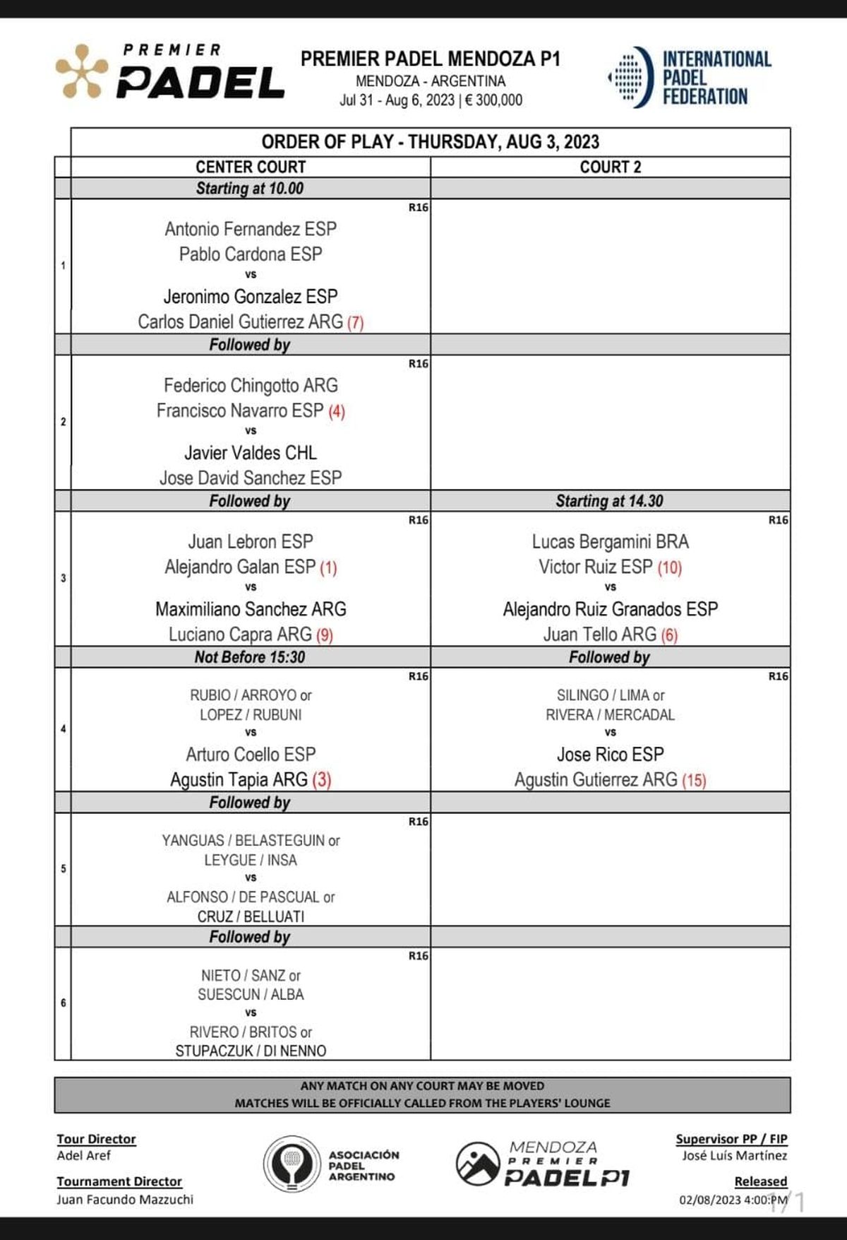 Más tarde, los número uno del mundo, Juan Lebrón y Alejandro Galán, jugarán con los preclasificados 9, Maxi Sánchez y Luciano Capra, y posteriormente los mejores del momento, Arturo Coello y Agustín Tapia serán rivales de los españoles Rubio y Arroyo, preclasificados 13.