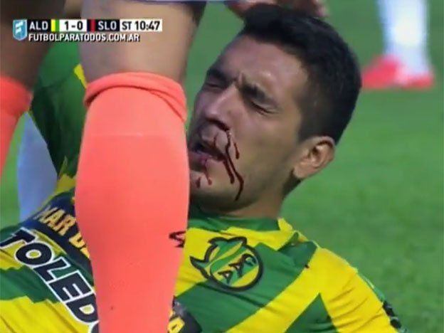 La sangre en el rostro de Rivero lo dice todo. Barrientos no frenó a tiempo, chocó contra el jugador de Aldosivi y le dio con su codo de lleno en la nariz.