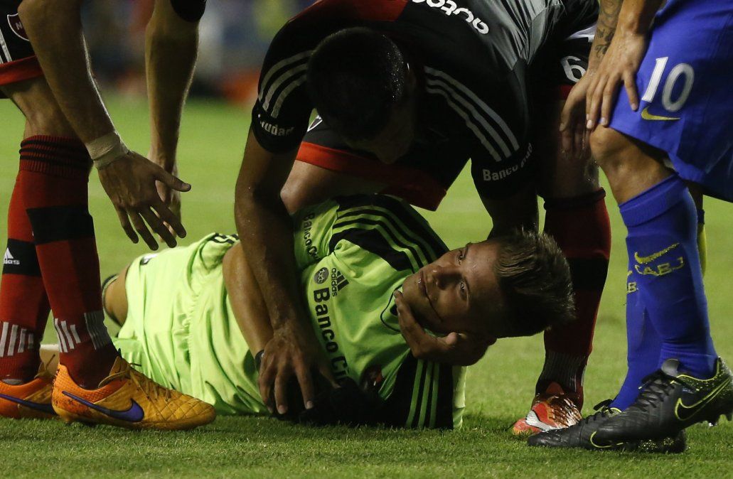 El delantero xeneize no supo medir la fuerza de su carrera cuando encaraba en el mano a mano al arquero y chocó duramente con la cara de Unsaín, que quedó tendido en el piso (sin perder el conocimiento eso sí) y debió ser sustituido por Sebastián D'Angelo.