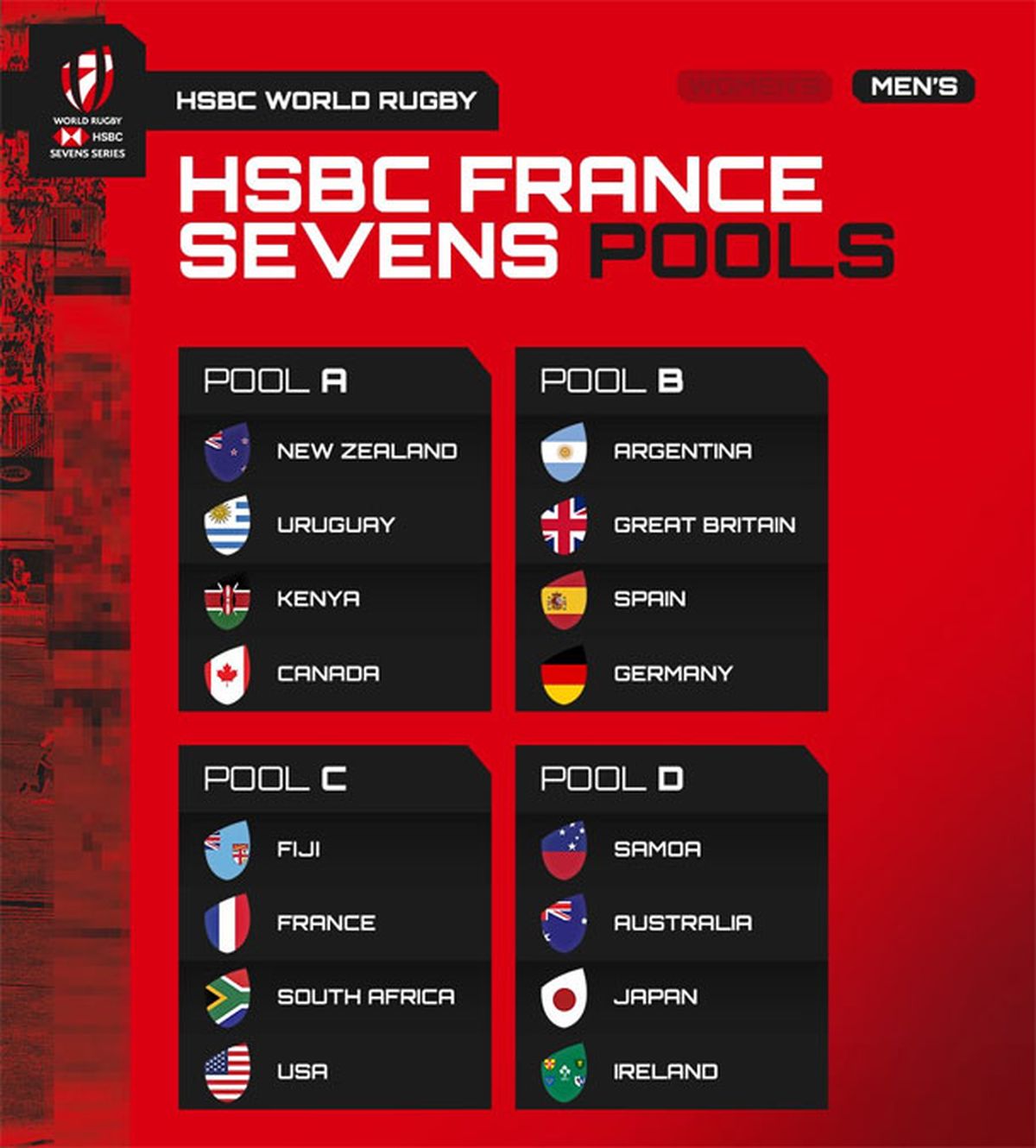 La zona A la conformarán los representativos de Uruguay, Nueva Zelanda, Kenia y Canadá, mientras que la zona C la integrarán Sudáfrica, Francia, Fiji y los Estados Unidos.