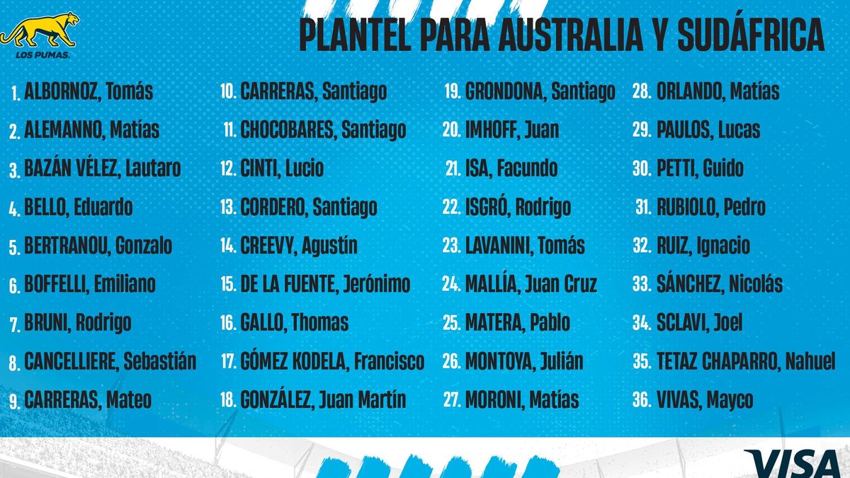 Santiago Grondona, Juan Imhoff, Facundo Isa, Rodrigo Isgró, Tomás Lavanini, Juan Cruz Mallía, Pablo Matera, Julián Montoya, Matías Moroni, Matías Orlando, Lucas Paulos, Guido Petti, Pedro Rubiolo, Ignacio Ruiz, Nicolás Sánchez, Joel Sclavi, Nahuel Tetaz Chaparro y Mayco Vivas.
