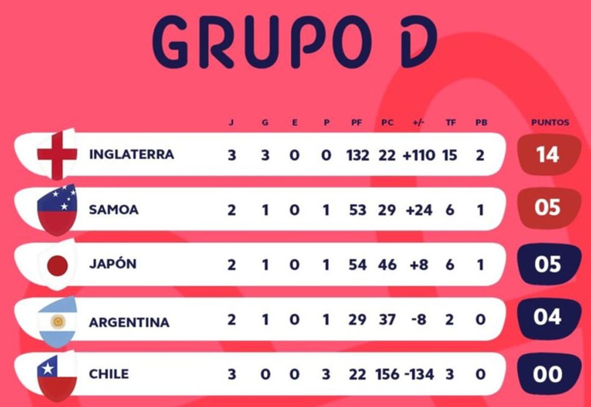 Hasta el momento Japón derrotó a Chile 42-12 y perdió frente a Inglaterra 34-12, mientras que Samoa también venció a Chile (43-10) y cayó con Los Pumas (19-10).