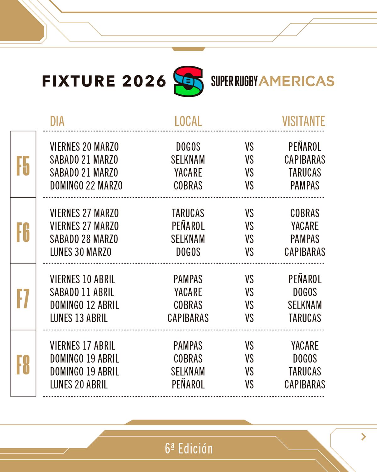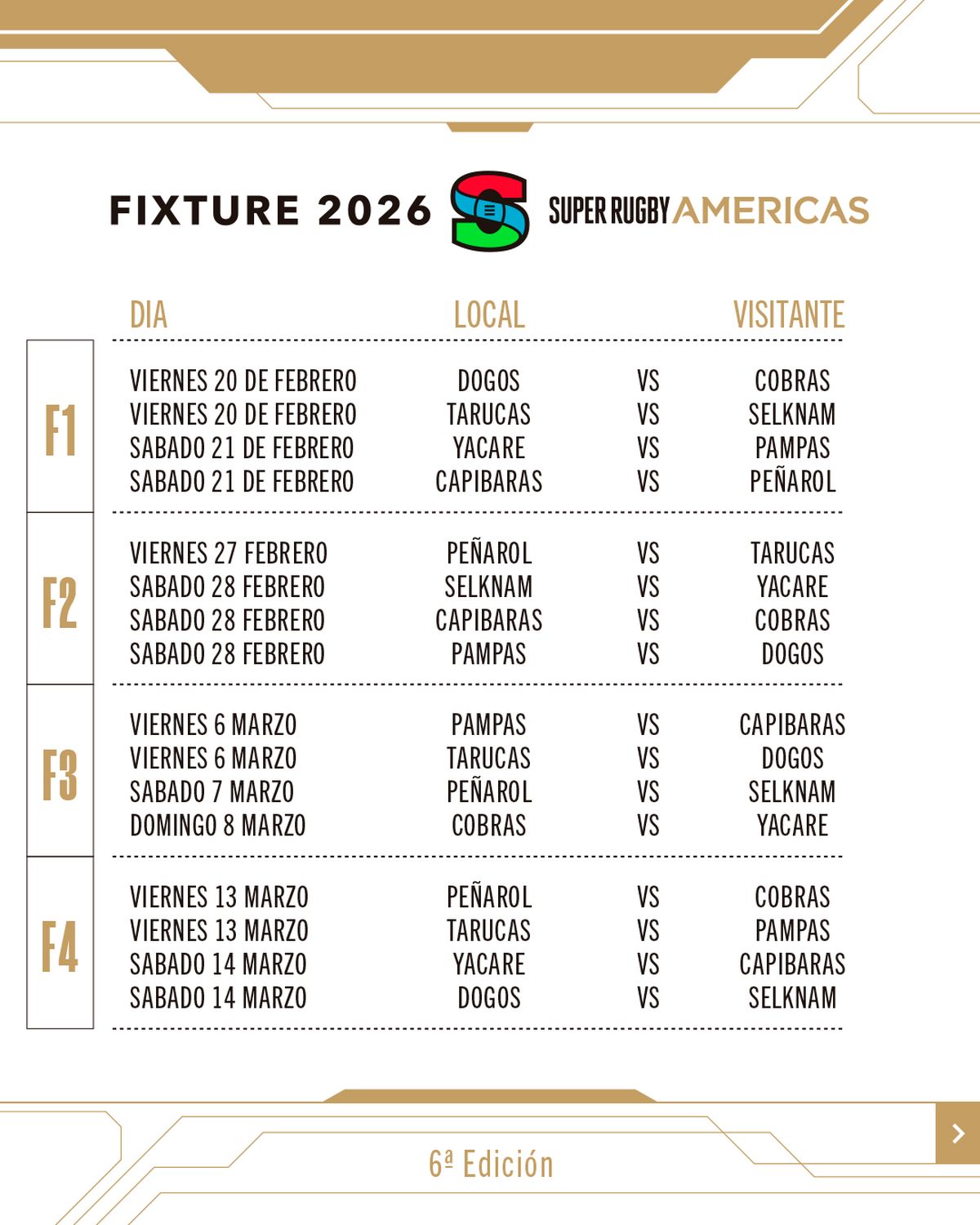 La jornada inicial del Sùper Rugby Américas 2026 será el viernes 20 de febrero y jugarán en Córdoba Dogos XV vs. Cobras y en Tucumán Tarucas vs. Selknam.