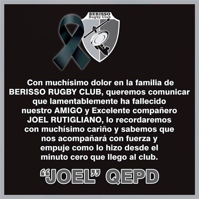 "Con muchísimo dolor en la familia de Berisso Rugby Club, queremos informarles que lamentablemente ha fallecido nuestro amigo y Excelente compañero Joel Rutigliano, a causa de Covid-19. Lo recordaremos con muchísimo cariño y sabemos que nos acompañará con fuerza y empuje como lo hizo desde el minuto cero que llego al club", publicaron desde la institución platense en la cuenta oficial de Facebook.