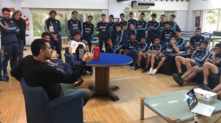 Juan Román Riquelme dio una charla a los seleccionados argentinos sub 15 y sub 17 dirigidos por Diego Placente y Pablo Aimar, respectivamente, en el predio de la AFA en Ezeiza.