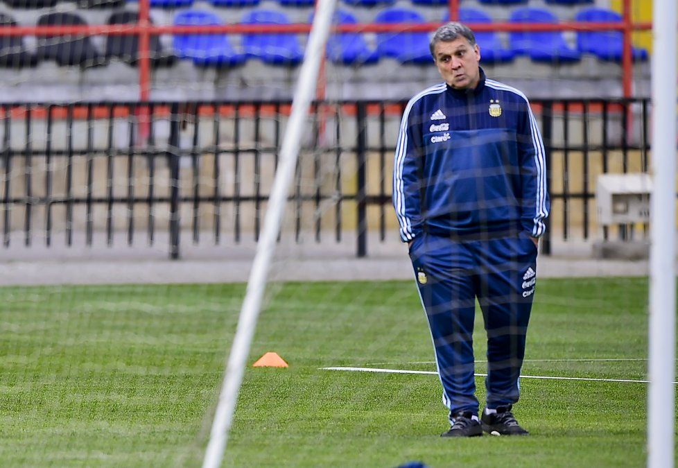 Martino está acompañado por Claudio Tapia, vicepresidente segundo de la AFA; Elvio Paolorroso, preparador físico, Omar Souto, Gerente de Selecciones Nacionales, y Luis Castro, Jefe del Departamento de Selecciones Nacionales.