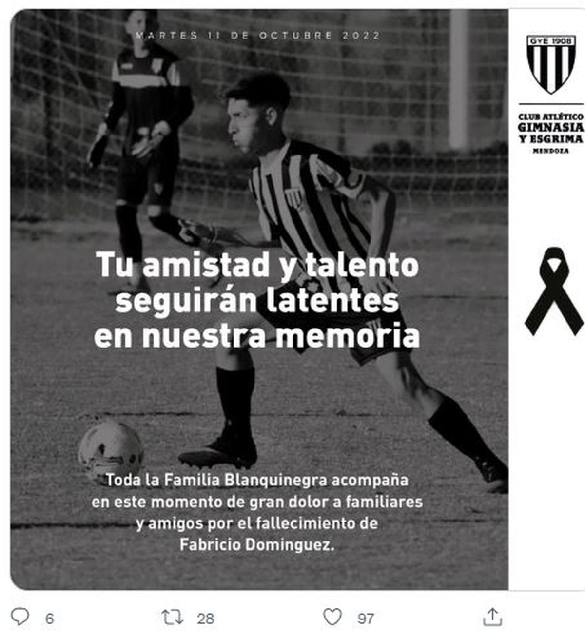 "Con profundo pesar la Unión Mendocina de Árbitros lamenta el fallecimiento del jugador de Gimnasia y Esgrima, Fabricio Domínguez. Desde esta unión, rogamos elevar una oración en su memoria y acompañamos a su familia en tan difícil momento".
