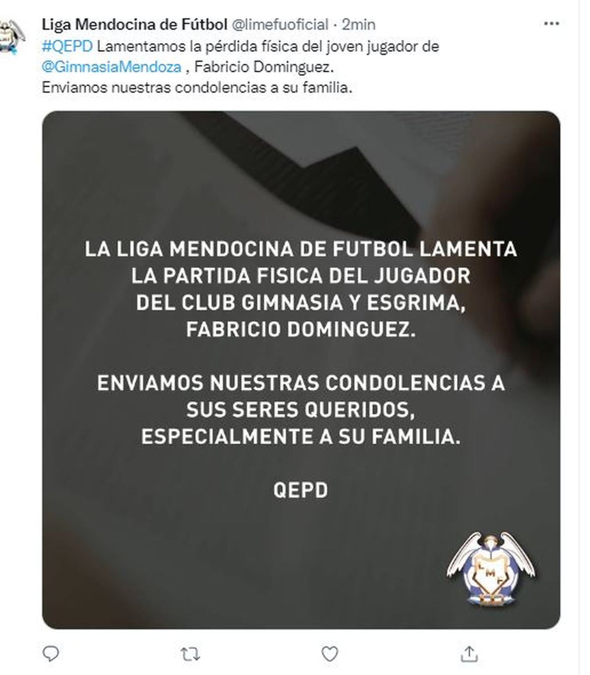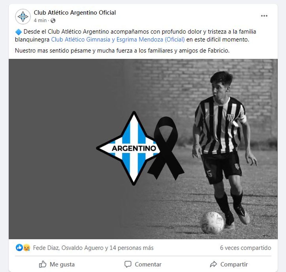 "La Comisión de Fútbol Juvenil e Infantil de la AFA lamenta profundamente el fallecimiento del joven Fabricio Domínguez, jugador de la 4ta división de Gimnasia de Mendoza. Nuestro respeto a familiares, compañeros y amigos".