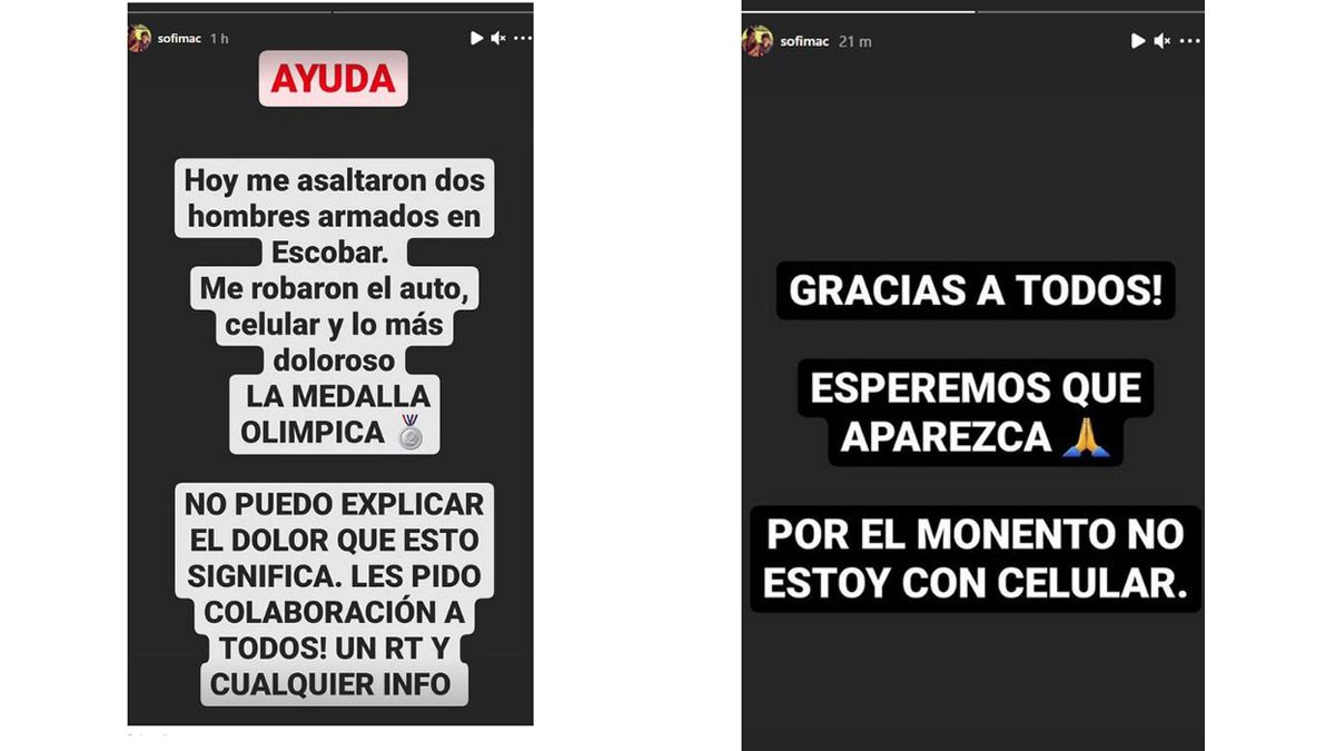 “Hoy me asaltaron dos hombres armados en Escobar. Me robaron el auto, celular y lo más doloroso LA MEDALLA OLÍMPICA. No puedo explicar el dolor que esto significa. Les pido colaboración a todos! Un RT y cualquier info”, aseguró Sofía Maccari en su cuenta de Instagram.