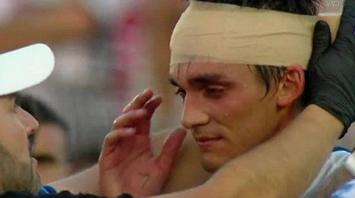 El atacante del Expreso quedó tendido en el suelo e inmediatamente fue atendido dentro del campo de juego, donde se le vendó la cabeza para que pudiera seguir jugando.