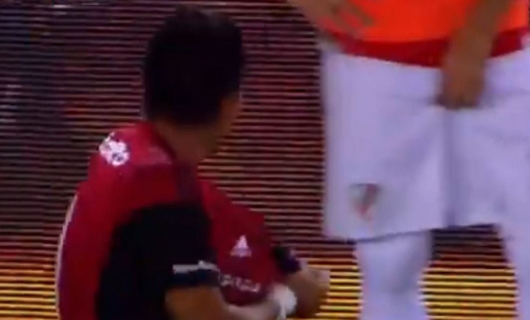 Sarmiento hizo su bailecito en el costado en el que estaban calentando los jugadores de River y Pinola le contestó con un gesto obsceno. La cámara de TV capturó el momento.