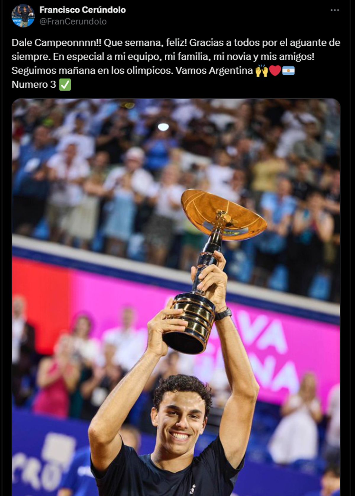 Es el tercer título ATP para el mayor de los hermanos Cerúndolo ya que había ganado antes en Bastad en 2022 y en Eastbourne en 2023, este último en césped.