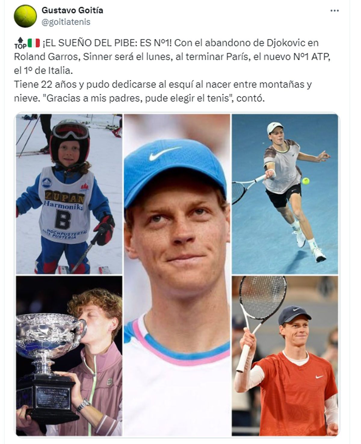El italiano Jannik Sinner se enteró que será el nuevo número uno luego del triunfo sobre Grigor Dimitrov en cuartos de final de Roland Garros y reconoció que “es el sueño de todos”.