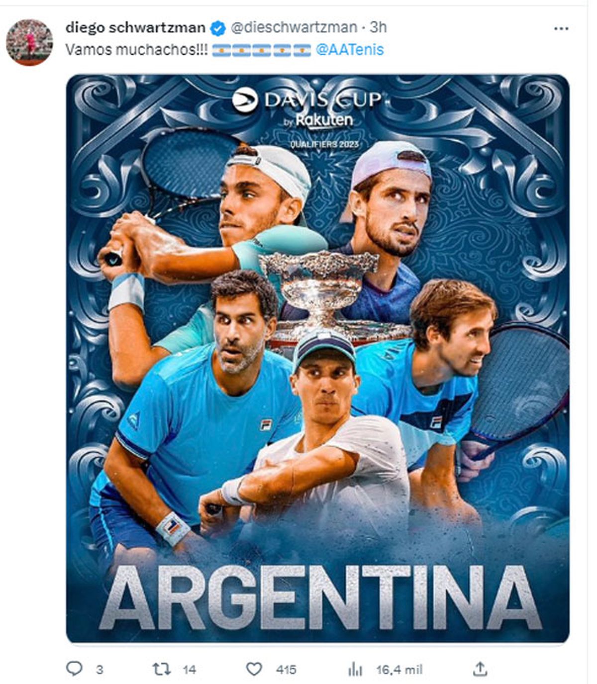"Vamos muchachos !! y la imagen de la bandera argentina, fue el mensaje que Diego Schwartzman publicó bien temprano en su cuenta oficial de la red social Twitter.