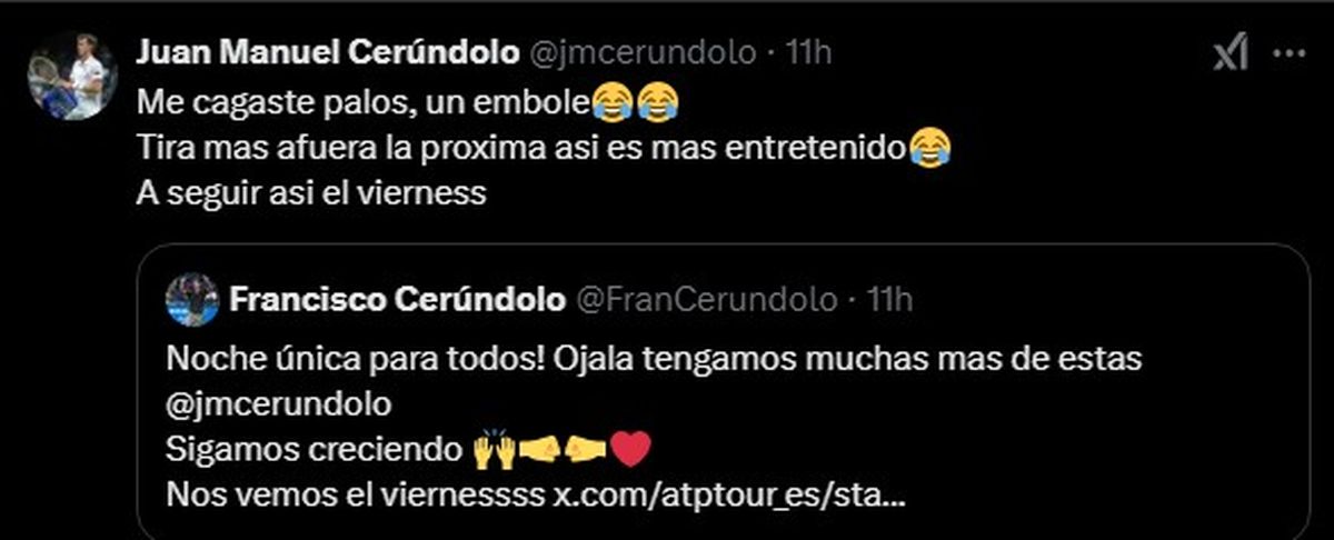 "Noche única para todos! Ojala tengamos muchas mas de estas Juanma Cerúndolo. Sigamos creciendo", dijo Francisco y la respuesta de su hermano menor, de 23 años, fue contundente: "Me cagaste a palos, un embole. Tira mas afuera la próxima así es mas entretenido. A seguir así el viernes".