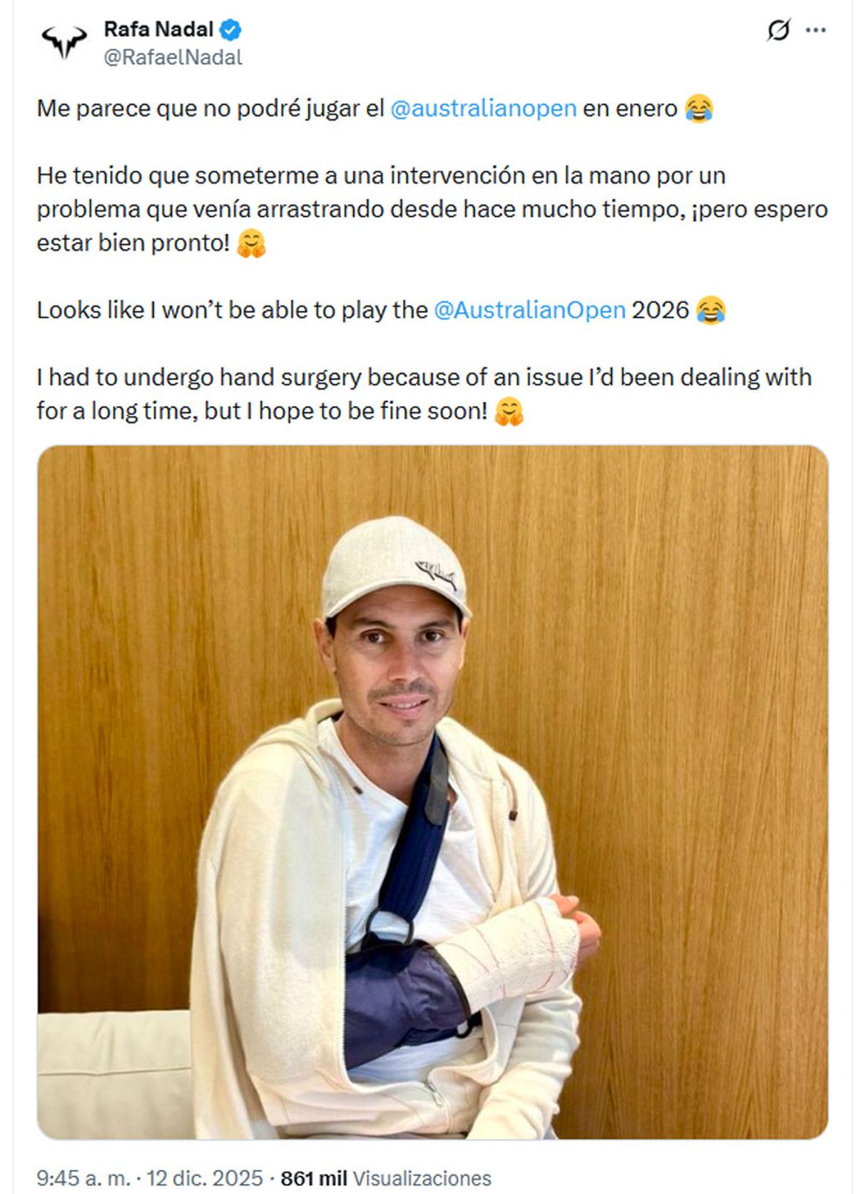 “Me parece que no podré jugar el Australian Open en enero. He tenido que someterme a una intervención en la mano por un problema que venía arrastrando desde años, pero espero estar bien pronto”, dijo el mallorquín a través de un posteo en sus redes sociales.
