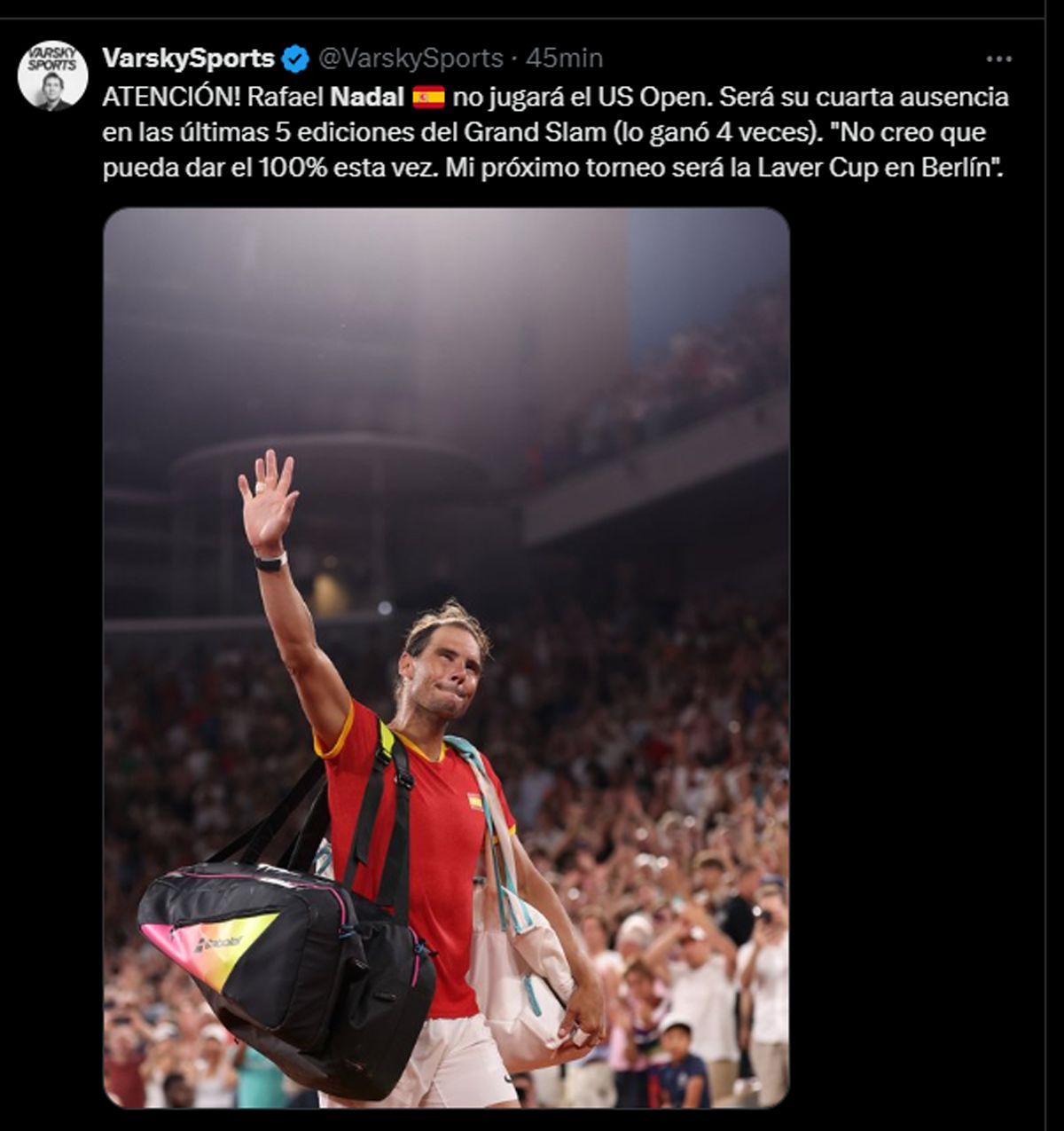 Pocos días después de su despedida de los Juegos Olímpicos, Rafael Nadal utilizó sus redes sociales para anunciar que no jugará el US Open, pero si irá a la Laver Cup donde muchos especulan que podría anunciar su retiro.