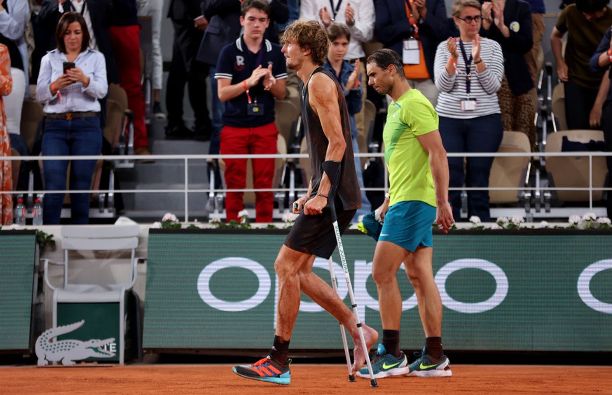 Hasta ese momento Nadal, 5to. en el ranking mundial de la ATP, y Zverev (3) protagonizaron una verdadera batalla en la cancha central Philippe Chatrier que terminó con el teutón llorando y abandonando la cancha ayudado por unas muletas.
