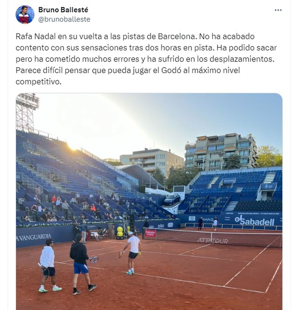 "Hola desde Barcelona. Primer entreno, con la ilusión de estar aquí estos días previos al inicio del torneo. Estoy aquí para ver qué tal, con las ganas de intentar jugar. Ya os iré contando. Importante decir que no quiero confirmar que jugaré, ojalá que sí. Ya veremos", expresó en sus redes sociales el de Manacor.