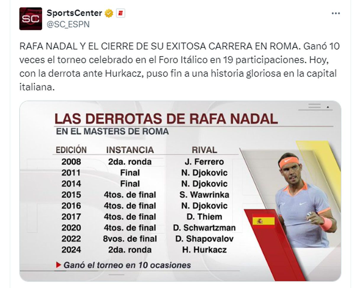 Nadal, diez veces campeón en la capital italiana y ganador de 70 partidos en este certamen, cayó 6-1 y 6-3 ante Hurkacz, siendo la primera vez en este regreso al circuito en la que debió medirse con un top 10.