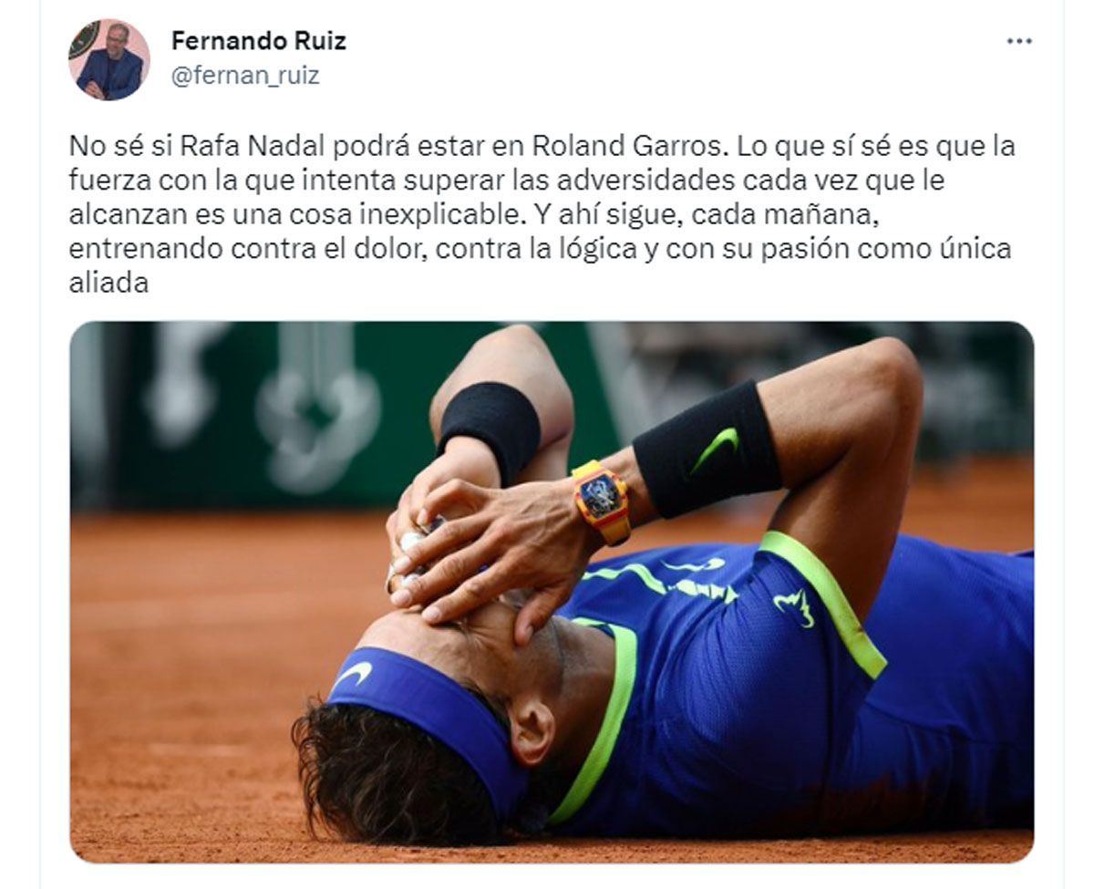 Nadal no se ha recuperado de su lesión y en las últimas semanas fue anunciando en sus redes sociales que no jugaría los torneos de Montecarlo, Barcelona y Madrid.