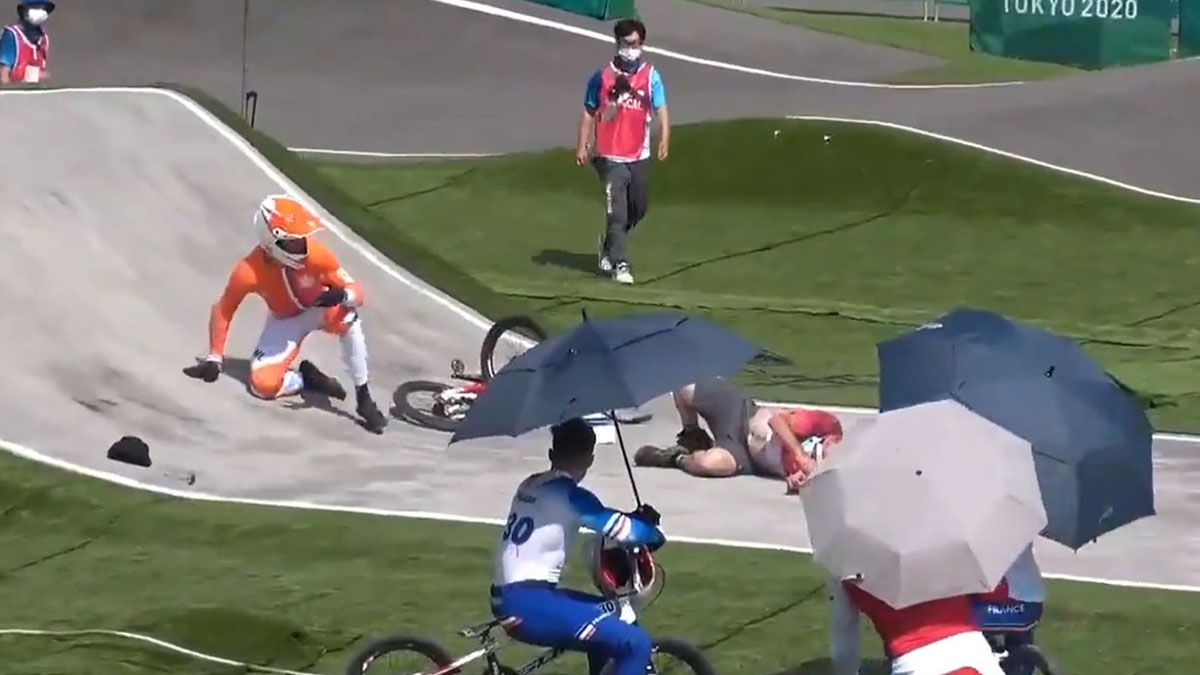 En plena práctica en la pista de BMX de Tokio, donde los riders calientan motores a pura adrenalina y explosividad, propio de esta competencia, un oficial de carrera protagonizó una caída absurda.
