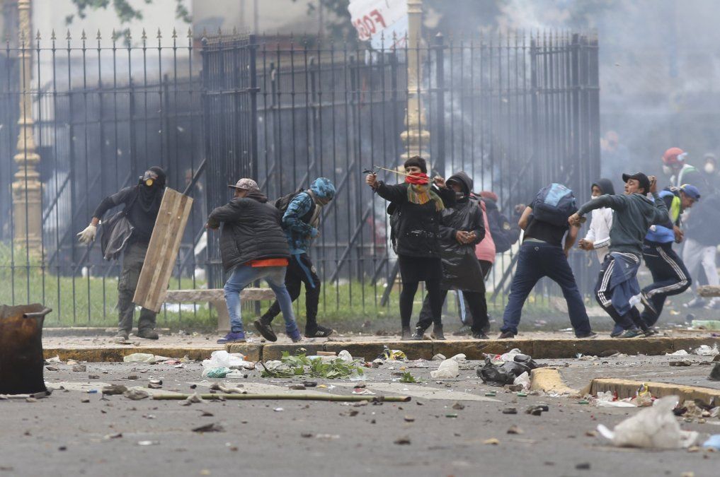 Los manifestantes tiraron piedras, palos, botellas y otros proyectiles contra la Policía, que los dispersó con balas de goma y camiones hidrantes. Hubo más de 20 detenidos y nueve agentes heridos.Bancos y veredas rotas, sectores parquizados convertidos en un barrial, mientras que algunos contenedores de basura fueron incendiados.