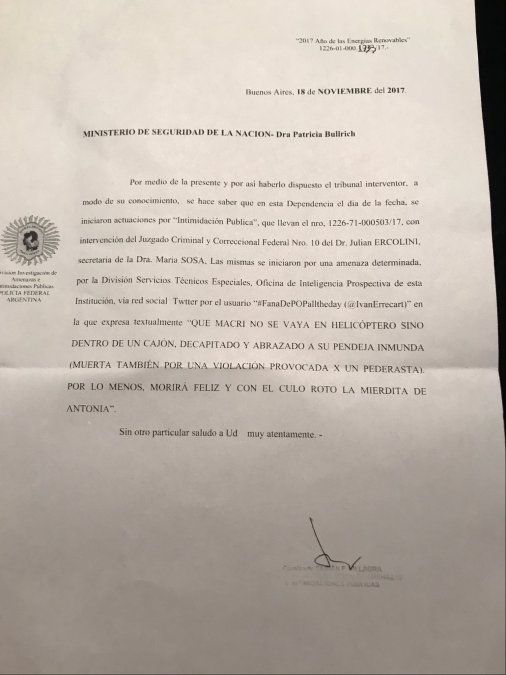 El Ministerio de Seguridad inició una investigación a raíz de una nueva amenaza contra el presidente Mauricio Macri y su hija Antonia realizada a través de una cuenta de Twitter.La cartera que dirige Patricia Bullrich presentó este domingo una denuncia penal por "intimidación pública" contra el usuario identificado como Ivan Errecart, que publicó el mensaje en la red social."Que Macri no se vaya en helicóptero sino dentro de un cajón, decapitado y abrazado a su pendeja inmunda (muerta también por una violación provocada por un pederasta). Por lo menos morirá feliz y con el culo roto la mierdita de Antonia", escribió esta persona. Si bien el tuit, realizado el 17 de noviembre pasado, fue borrado del perfil del sospechoso unas horas después de haber sido posteado, el Gobierno logró tomar conocimiento de la intimidación gracias al trabajo del Departamento de Delitos Tecnológicos de la Policía Federal.La causa quedó en manos del juez federal Jualián Ercolini, quien estudia el mensaje que tuvo más de 500 respuestas por parte de otros usuarios."Estas amenazas brutales inmediatamente se investigan", destacó a través de la misma red social la ministra Bullrich, quien compartió además una foto de la denuncia.