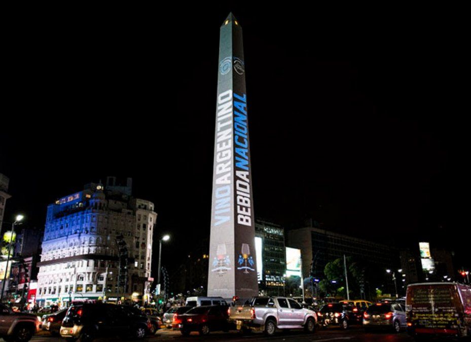 Por iniciativa del Fondo Vitivinícola bajo el lema "El vino nos une" y con motivo del Día Nacional del Vino que se celebra este jueves, el Obelisco se convirtió por la noche en una gran copa para brindar por la bebida nacional.