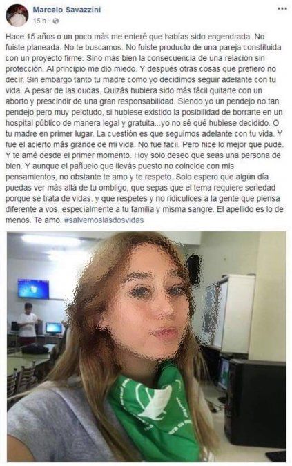 Tras haber publicado un extenso posteo en Facebook donde en el día del Padre le escribe a su hija que "no fue buscada ni planeada" y que si el aborto hubiera sido legal "quizás hubiera sido más fácil quitarte y prescindir de una gran responsabilidad", el hombre aseguró en otra red social, Twitter, que desde la publicación su hija no le dirige la palabra.