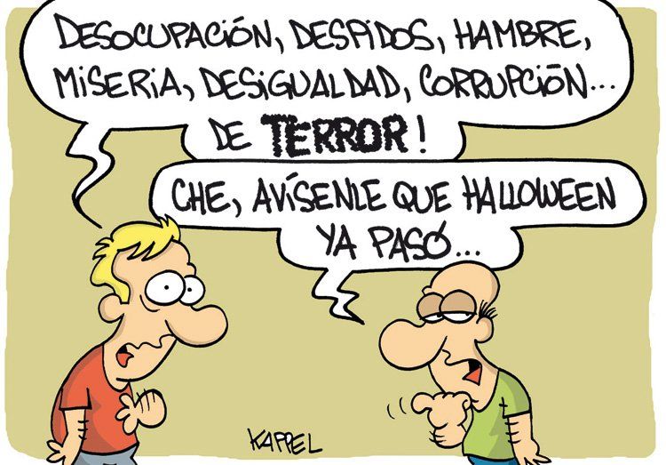 Inicio País Humor El humor de Kappel. 01 de noviembre de 2017 - 08:34 Nuestro "Halloween" de cada día Por UNO Temas relacionados: Humor El humor de Kappel las más leídas Tragedia en el escuela Una nena de 6 años se golpeó la cabeza en el recreo y murió Por Pablo González Mundo El aeropuerto sobre la cordillera de los Andes que un país de Sudamérica moderniza con más de US$30 millones y estará listo en 2027 Por Valentina Araya Elecciones Cuatro fórmulas con el radicalismo fracturado componen por ahora la carrera por la UNCuyo Por Pablo Abihaggle Viviendas Alfredo Cornejo afirmó que "se terminó el calvario de las familias para poder escriturar sus casas" Por Redacción de UNO Te puede interesar Sábado 25 de abril Chapote y Marita Parangachully se juntan por primera vez en el Teatro Quintanilla