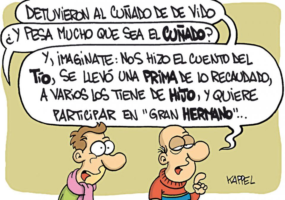 Inicio País Humor El humor de Kappel. 09 de agosto de 2017 - 09:25 Típico caso del cuñado del tío del hermano del primo de... Por UNO Temas relacionados: Humor Julio De Vido El humor de Kappel las más leídas Es concejal electo La condena de la Corte al antiminero Marcelo Romano desató un conflicto por su banca Por Rosana Villegas Avance en la causa Imputaron al Piter Morales como el instigador del ataque a la nena baleada en Godoy Cruz Por Sebastián Salas Planteo empresarial Tres ministros recibieron a cámaras empresariales tras el reclamo de las pymes Por Rosana Villegas Viviendas Casa propia: cómo ser dueño de una vivienda del IPV y pagar $323.000 de cuota Por Daniel Calivares Te puede interesar Sábado 25 de abril Chapote y Marita Parangachully se juntan por primera vez en el Teatro Quintanilla
