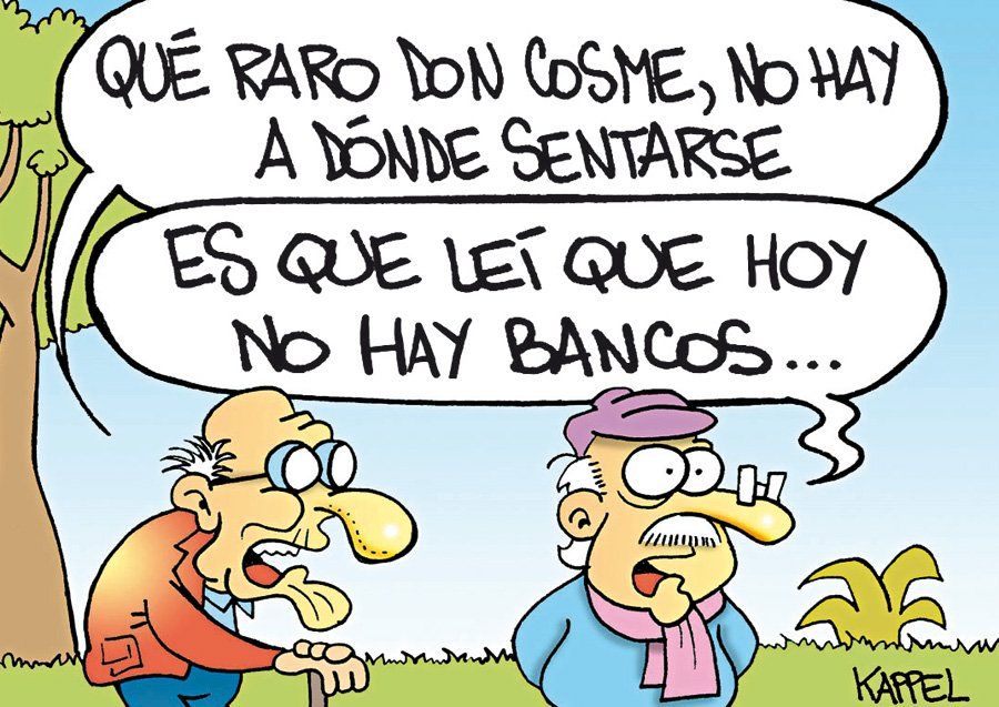 Inicio País El humor de Kappel El humor de Kappel. 19 de febrero de 2018 - 09:05 Típico día de un paro "bancario" Por UNO Temas relacionados: El humor de Kappel Humor las más leídas Inversiones En ascenso: el precio del dólar para este martes 28 de abril fue confirmado por los bancos Por Daniel Calivares Guía escolar Mendoza tiene un nuevo protocolo de seguridad para actuar ante amenazas de tiroteos o bombas Por Rosana Villegas Investigan las causas Tragedia inesperada: se asomó a la ventana de su casa y recibió un disparo fulminante Por Luciano Carluccio Allanamiento Una barbería era la pantalla de un prostíbulo donde explotaban a personas en situación de vulnerabilidad Por Redacción de UNO