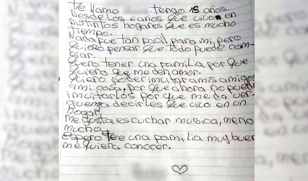 "Me llamo Lucía. Tengo 15 años. Desde los 6 años que vivo en distintos hogares que es mucho tiempo. Nada fue tan fácil para mi, pero quiero pensar que todo puede cambiar. Quiero tener una familia porque quiero que me den amor", escribió la joven en la carta.