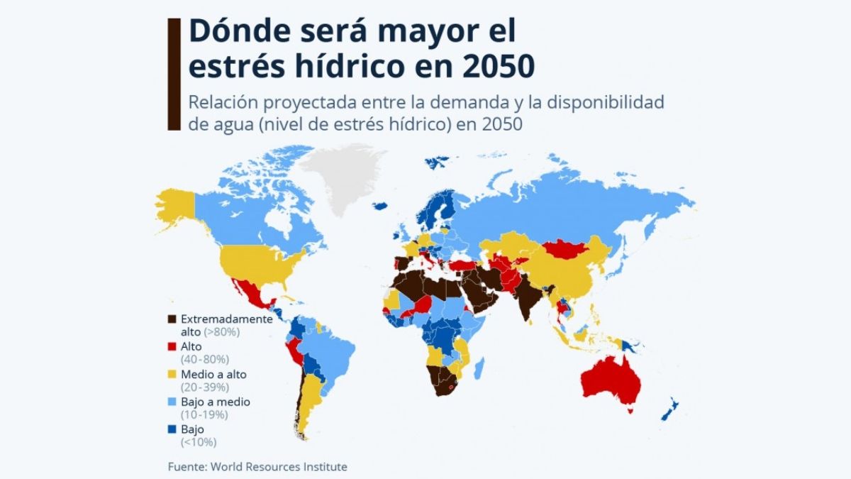 "Sin una mejor gestión del agua, el crecimiento demográfico, el desarrollo económico y el cambio climático empeorarán la situación" (WRI). Así, hoy, alrededor de 4 mil millones de personas, la mitad de la población mundial, están expuestas al estrés hídrico durante al menos un mes al año. Para 2050, esa cifra podría acercarse al 60%. El estrés hídrico es una situación en la que la demanda de agua excede el suministro disponible en una región particular. Ocurre cuando no hay suficiente agua dulce para satisfacer las necesidades de las personas, las industrias, la agricultura y el ambiente. La demanda de agua está aumentando a nivel mundial y ha aumentado más del doble desde 1960.