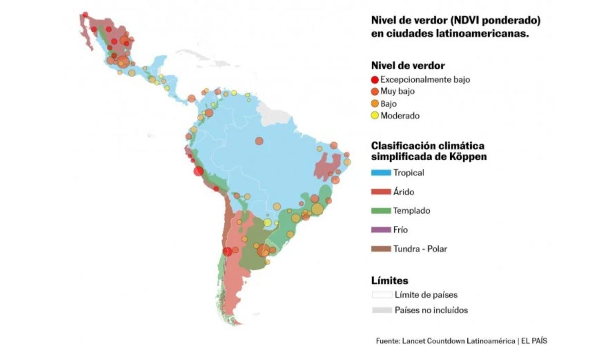 Ninguno de los 109 centros urbanos de América Latina examinados por The Lancet tenían niveles de espacios verdes que se pudieran clasificar en la categoría de "altos y superiores". Solamente 12 centros (el 11% del total) tenían niveles moderados.