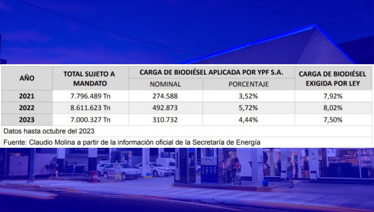 Molina asevera también que la diferencia entre la mezcla prevista por la norma de aquella efectivamente aplicada por la compañía rondaba un 30% en 2022 y un 40% en los primeros 10 meses del 2023. Incluso hubo meses de 0% de corte, importando más gasoil del necesario en un contexto de alto desequilibrio energético.