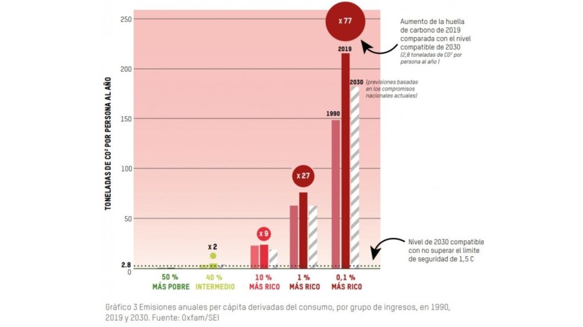Para limitar el calentamiento global a largo plazo a 1.5 °C es necesario que, en 2030, el total de las emisiones globales se haya reducido en un 48 % (en comparación con los niveles de 2019). Nuevas previsiones basadas en la investigación del Instituto de Medio Ambiente de Estocolmo, Suecia (SEI) y Oxfam Internacional apuntan a que, en 2030, las emisiones per cápita derivadas del consumo de las personas más ricas del mundo (el 1 % más rico) multiplicarán por más de 22 el nivel compatible con el objetivo de limitar el calentamiento global a 1.5 °C, que equivaldría a 2,8 toneladas de dióxido de carbono (CO2) per cápita al año. Por el contrario, se prevé que las emisiones de la mitad más pobre de la población sigan siendo una quinta parte del nivel compatible con mantener el calentamiento global en 1.5 °C.