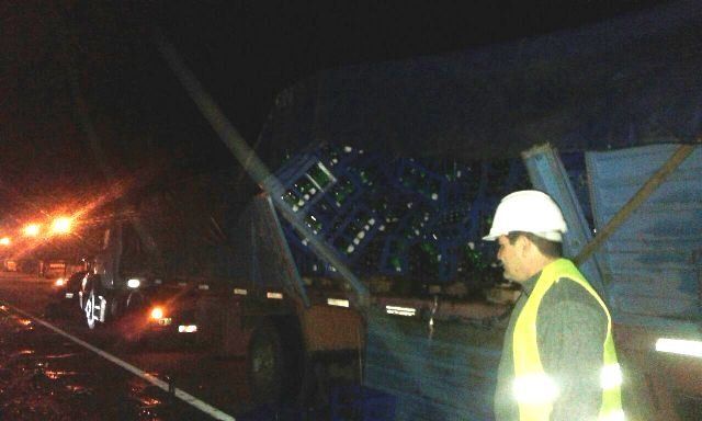 Una mujer al mando de un Dodge 1.500 que viajaba hacia el sur tenía la compañía de un camión Mercedes Benz repleto de botellas de vidrio que iba en la misma dirección. Todo trancurría con normalidad pero al parecer la conductora del automóvil realizó una mala maniobra y el caminero tuvo que apelar a toda su destreza para no pasarla por arriba.