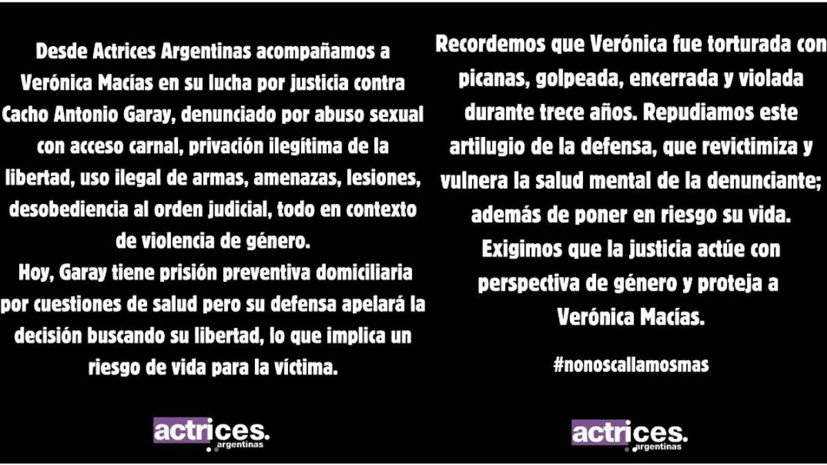 Actrices Argentinas apoyó a Verónica Macías y repudió el pedido de libertad de Cacho Garay