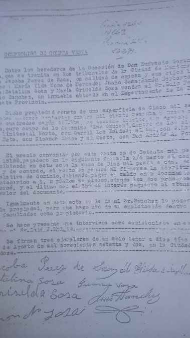La venta la hizo, como sucesores, Jacoba Pérez de Sosa, esposa de Eufrasio, y "sus hijos legítimos" (SIC) María Ilda Sosa de Mercado, Juana Sosa, Ramón Norberto Sosa, Catalina Sosa y Mariana Griselda Sosa. Algunos otros hijos no habrían firmado ese boleto. El comprador fue Luiz (con z) Fernando Sánchez, padre y abuelo de los ahora detenidos.